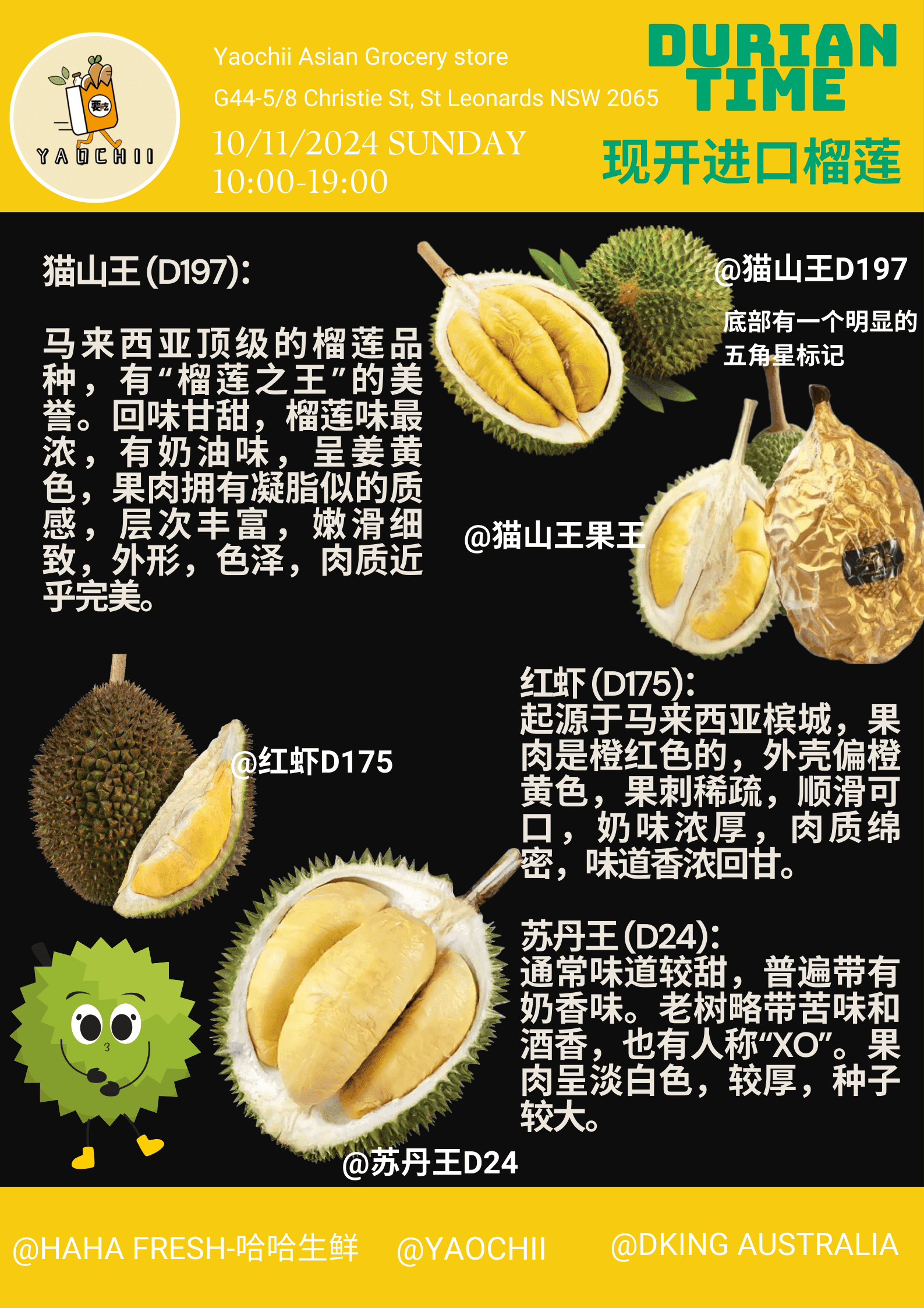 We are excited to bring you freshly opened, premium Malaysian durians! We offer a variety of top-quality durians, including:
